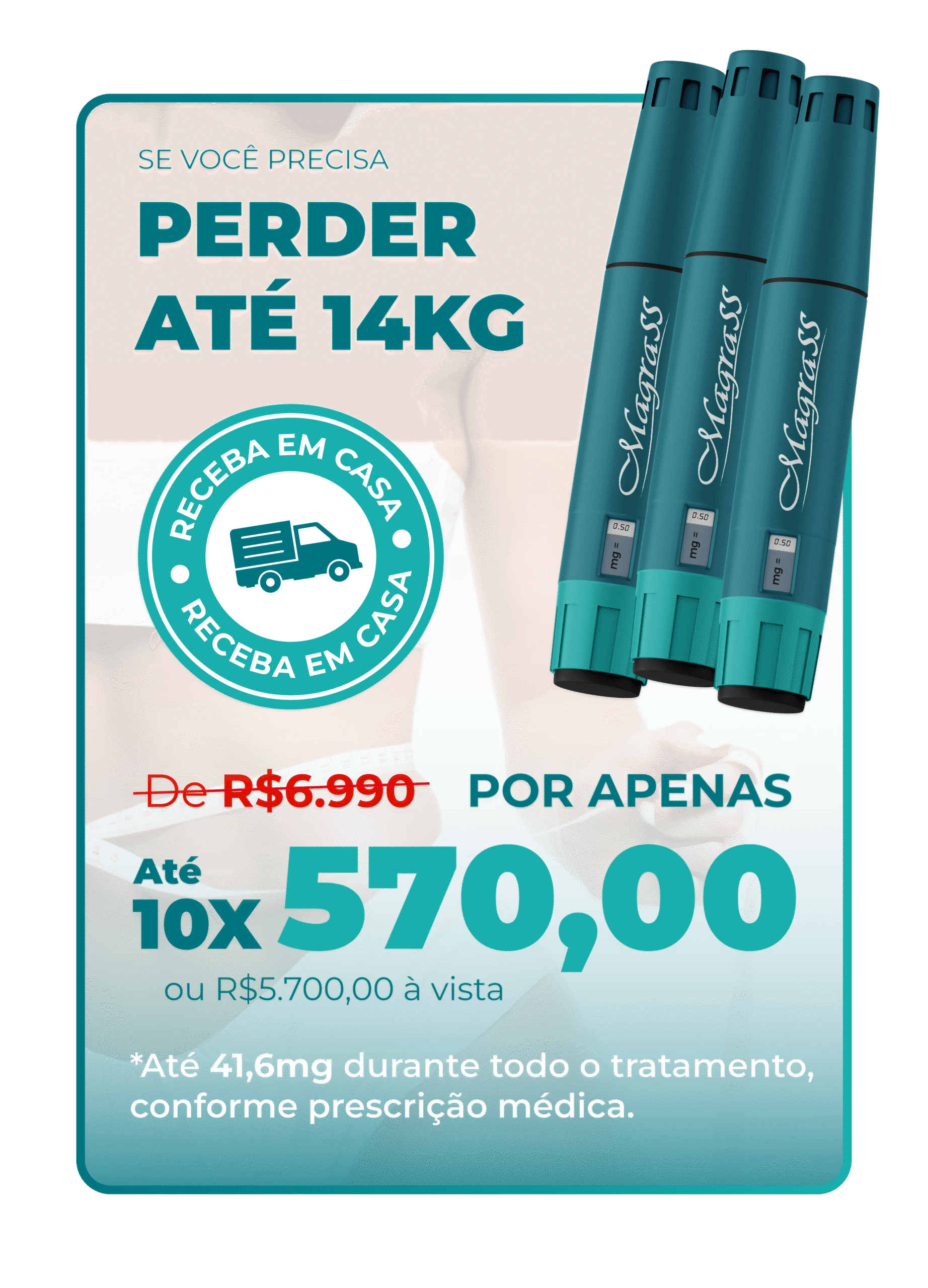 Quando indicado pelo médico, você conta com doses semanais de Tirzepatida, uma das mais modernas aliadas no processo de emagrecimento, sempre sob prescrição e acompanhamento profissional.